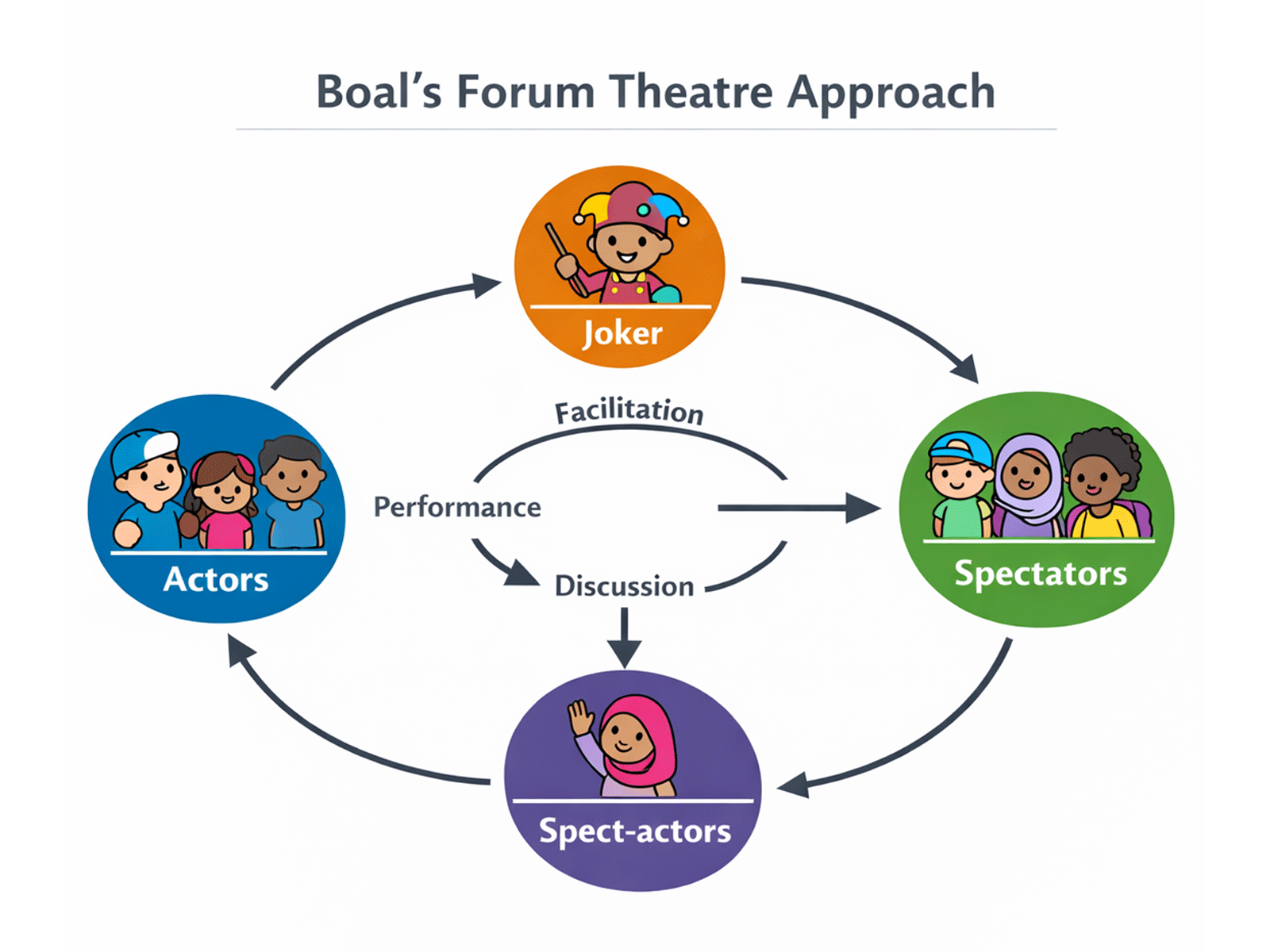 Importantly, Forum Theatre places all participants on an equal footing and supports the identification of issues, discussion of challenges, and co-creation of solutions in a safe and creative environment.